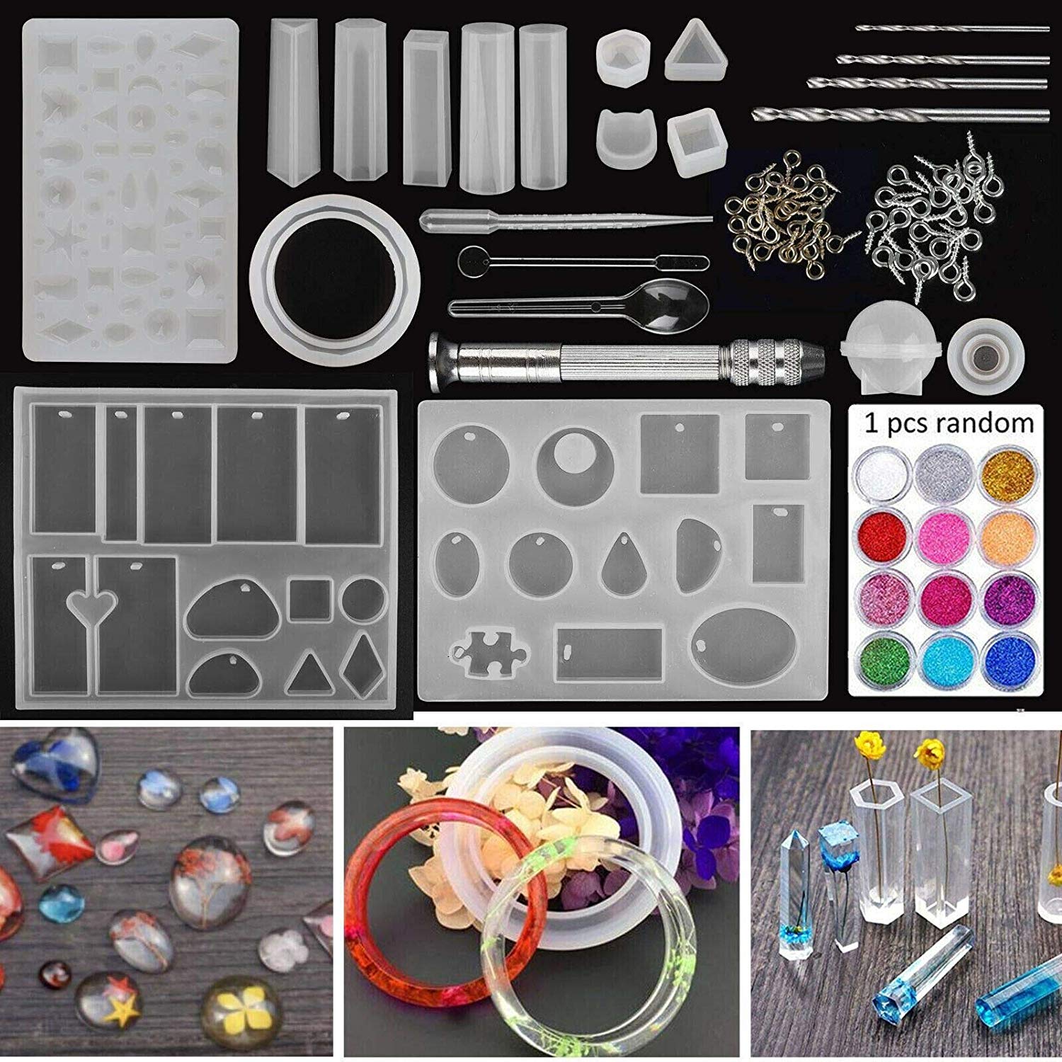 - PREMIUM MATERIAL: Made with silicone resin mold that is flexible, durable, and smooth. The screw eye pins and hand twist drill are made of high-quality metal material. The stirrers, droppers, and spoons are made of quality plastic. The materials are safe and environmentally-friendly with non-toxic materials.